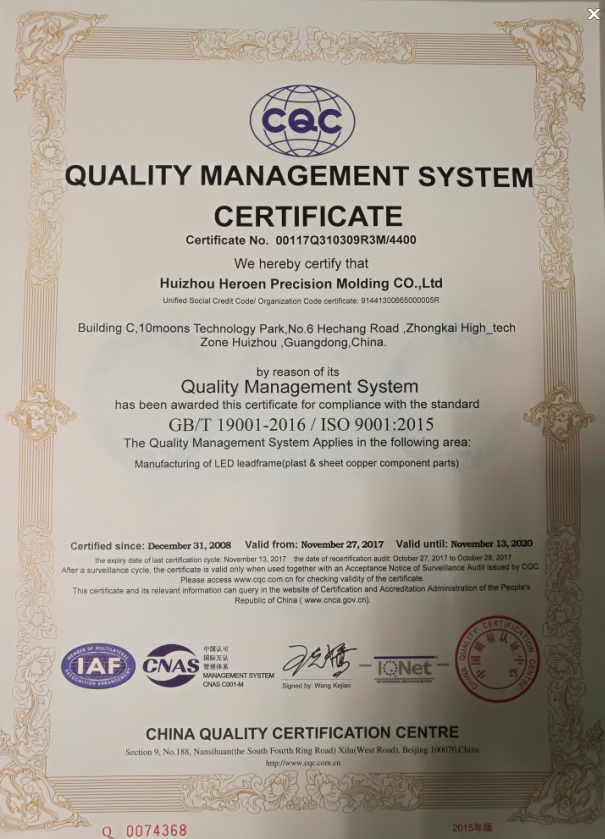 In September 2017, passed the ISO9001:2015 quality system certification.
